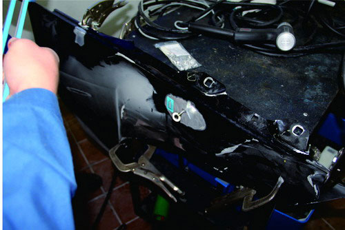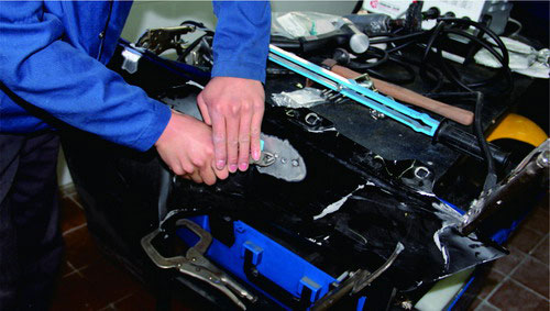 在鋁質(zhì)面板修復(fù)時,也可使用鋁整形機對損傷部位進行拉伸修復(fù),在經(jīng)整形機修復(fù)到位后,使用專用工具將螺紋介子齊根剪下,再打磨平整即可。對于鋼板車身來說,當(dāng)面板和內(nèi)層結(jié)構(gòu)同時發(fā)生變形時,可以采取內(nèi)外層分離、分別修整,然后折邊咬合的修復(fù)方法。對于鋁質(zhì)面板,不能使用這種方法,否則由于鋁的韌度較差,折邊部位會出現(xiàn)裂紋或斷裂。