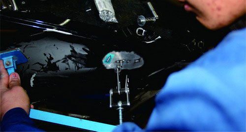 (8)相對于鋼板修復(fù),鋁質(zhì)車身板件更換的定位工作顯得更為重要。鋁質(zhì)車身粘接部位的粘接膠需要較長的固化時間,為防止粘接膠在固化后車身尺寸產(chǎn)生位移或變動,測量后必須使用定位夾或通用夾具對更換部件進行定位。