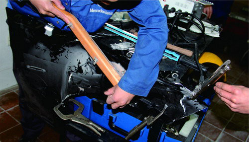 ①由于鋁板的延展性不及鋼板,在受到碰撞產(chǎn)生變形后,鋁板不容易恢復(fù)原來的尺寸。因此,對鋁板的變形應(yīng)采取多次輕敲法。