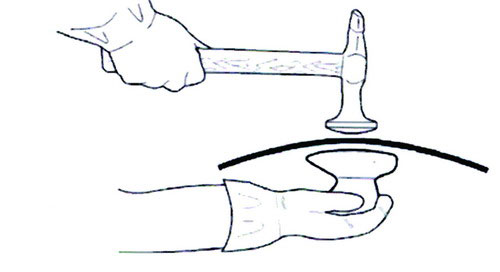 (1)為了降低拱起部位的高度,如果采用正托敲擊法,操作時應(yīng)多次輕敲,不能重敲,否則錘擊太重或次數(shù)過多會使鋁板延展拉伸,如圖1-89所示是正托敲擊法示意圖。