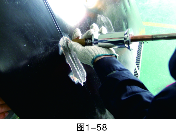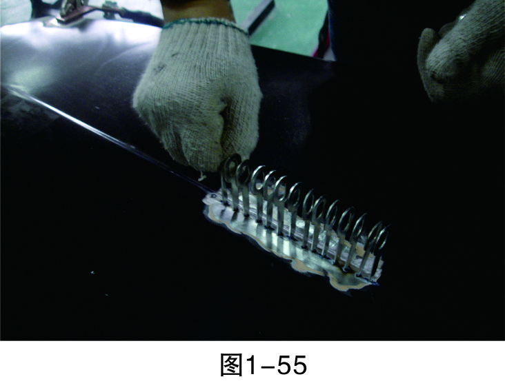 步驟18(拉低打高):對(duì)相對(duì)低的位置進(jìn)行拉伸,對(duì)相對(duì)高的位置進(jìn)行敲擊,要注意焊拉槍與鈑金錘的配合,重點(diǎn)是把握好力度,如圖1-59所示。