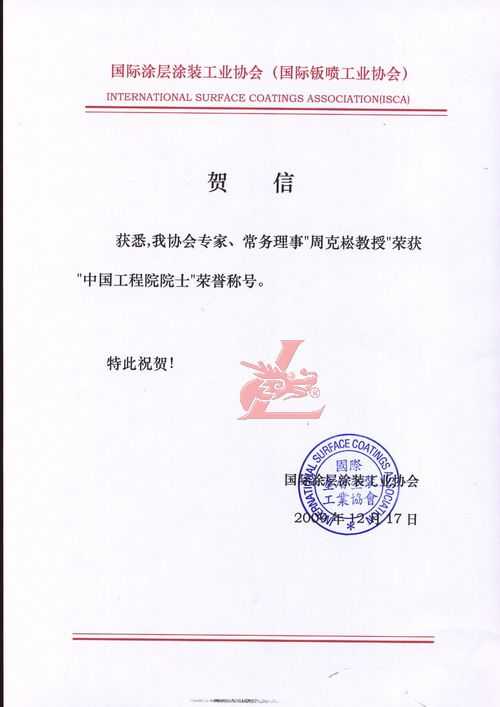 賀國際涂層涂裝工業(yè)協(xié)會專家常務理事克崧教授榮獲“中國工程院院士”[龍神秘書單位處] 賀國際涂層涂裝工業(yè)協(xié)會專家常務理事克崧教授榮獲“中國工程院院士”[龍神秘書單位處] 珠海龍神有限公司秘書處賀 2009-12-19 8981