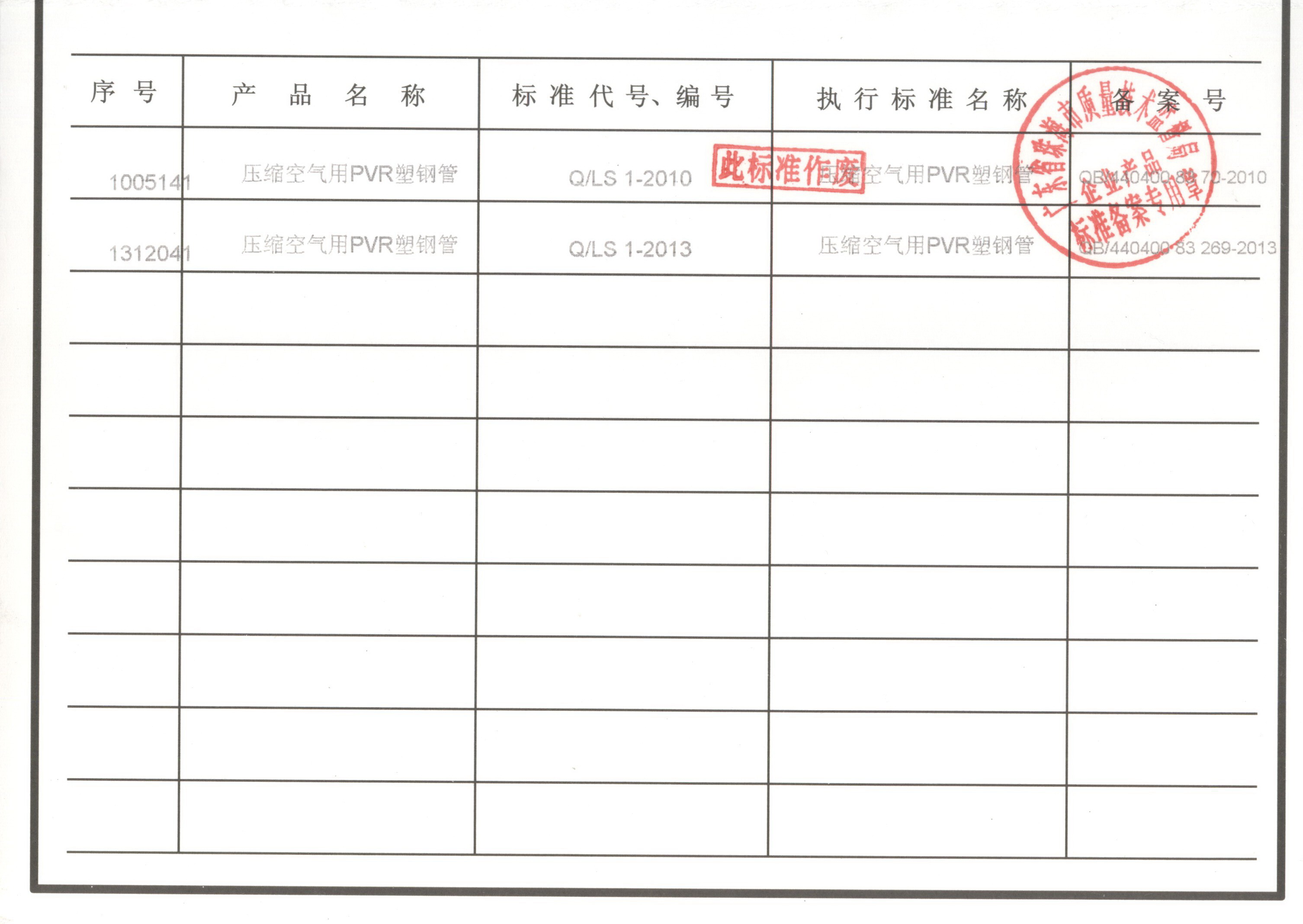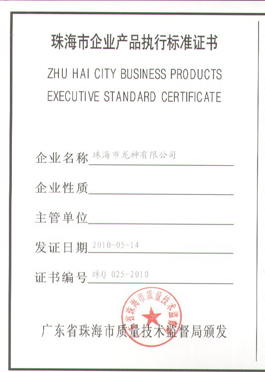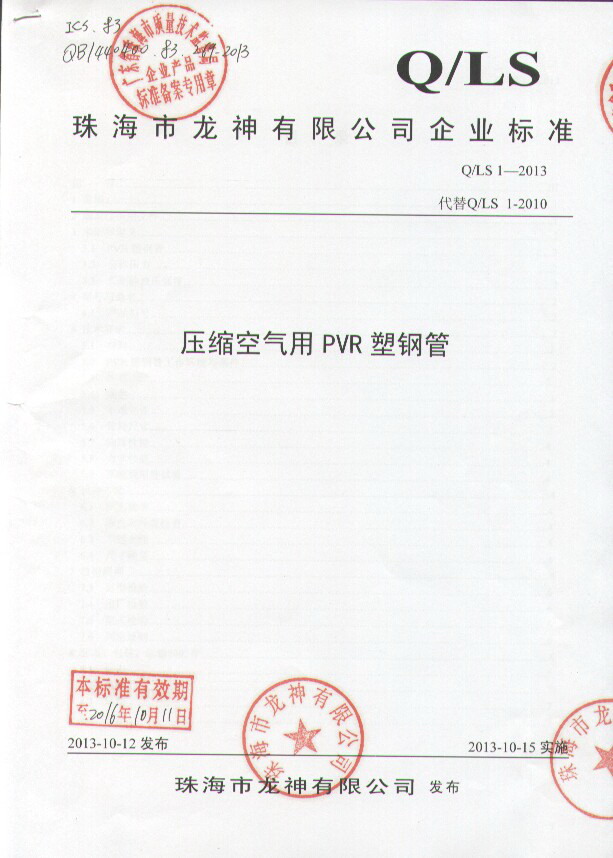 企業(yè)執(zhí)行標(biāo)準(zhǔn) 珠海市企業(yè)產(chǎn)品執(zhí)行標(biāo)準(zhǔn)證書(shū) 珠海市龍神有限公司企業(yè)執(zhí)行標(biāo)準(zhǔn) 壓縮空氣用PVR塑鋼管 2012-11-27 34866